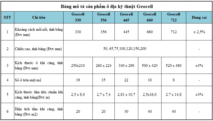Dưới đây là bảng mô tả các sản phẩm Geocell thông dụng nhất.