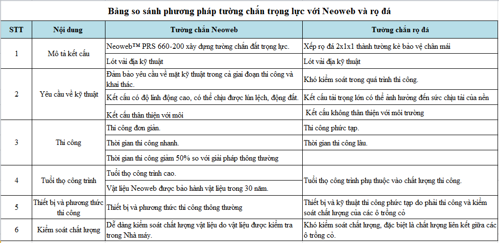Bảng so sánh hiệu quả xây tường chắn đất giữa Neoweb và bê tông cốt thép